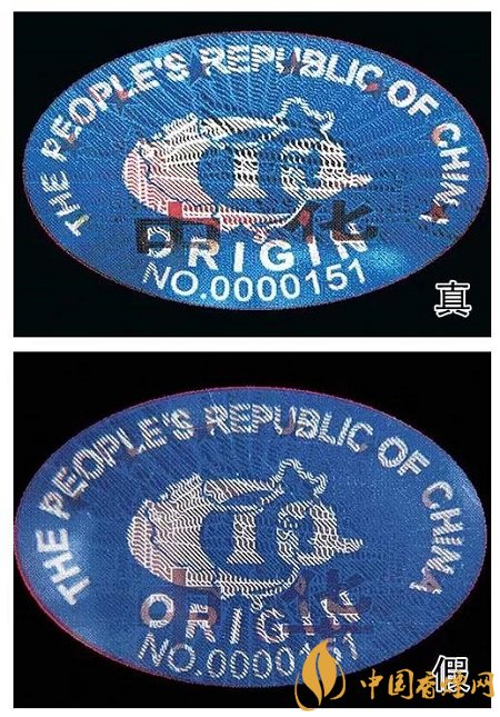 4、“中華”原產(chǎn)地標(biāo)志為藍色橢圓形,折光可見“中華”字樣、8顆“★”及天安門圖案。真煙色彩飽滿,圖案清晰;假煙色彩暗淡,圖案模糊。