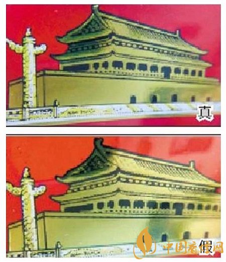 真煙天安門左側(cè)華表套色均勻,黃白色分布有明顯分界點,邊緣光滑、干凈、清晰;假煙套色較差,黃白色不明顯,黃色部分印刷較分散,字體邊緣套印有毛渣點,呈現(xiàn)鋸齒狀。