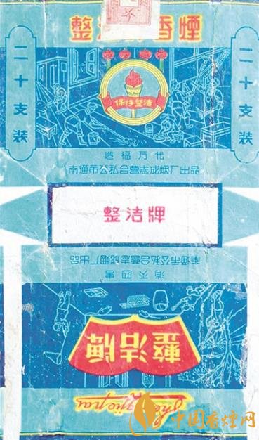 當時,南通市公私合營志成煙廠出品了一枚“整潔牌”煙標(如上圖)。這枚采用白描藝術手法設計的煙標,主版是一幅“造福萬代”的主題圖案:畫面中心掛有四盞紅燈籠,下部有一把裝飾著紅綢帶、帶有“保持整潔”字樣的火炬。