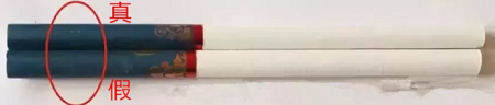 真品卷煙的濾嘴棒為兩排激光打孔;假冒卷煙的濾嘴棒沒有激光打孔或者打孔不透氣,并且煙支較短。