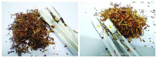 真品濾棒中添加了“香潤珠”,油潤性好切絲均勻,顏色呈現(xiàn)金黃色;假煙濾棒未添加“香潤珠”,煙絲干直切絲粗細不一,顏色呈現(xiàn)出淺褐色,與真品存在顯著差異。