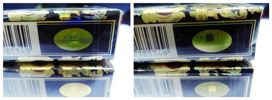真品防偽技術(shù)具有在圖像3D潛影特征,給人的感覺好像是文字和圖案潛伏在印刷品當(dāng)中一樣,使用現(xiàn)代超高精準(zhǔn)度的掃描儀和照相制版都不能再呈現(xiàn)的立體效果,防止印刷品被復(fù)制;假煙多采用照相復(fù)制技術(shù),其文字和圖案印在表面無法呈現(xiàn)出3D效果,與真品防偽標(biāo)志存在顯著差異。