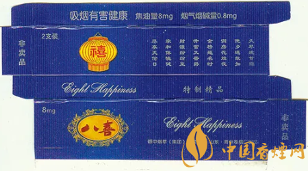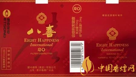 “八喜”香煙高貴典雅的煙標裝潢設(shè)計,曾獲得第八屆華東裝潢設(shè)計大獎?wù)棺罴褎?chuàng)意獎。“八喜”香煙問世后,青州卷煙廠得知人們很想知道“八喜”具體指哪“八喜”,于是該廠于1999年向社會廣泛征集吉祥語,從中精選出“久旱逢甘霖、他鄉(xiāng)遇故知、洞房花燭夜、金榜題名時、升官又晉爵、財源紛紛至、家和體魄健、盡享天倫日”等八句具有代表性的吉祥語,作為“八喜”的詮釋和具體所指。