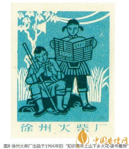 徐州火柴廠出品于同年的四枚/套的“知識青年上山下鄉(xiāng)”火花,“讀書看報”(圖8)一枚再現(xiàn)了一對知青利用休息間隙,在田間地頭讀書看報補(bǔ)充知識的畫面。