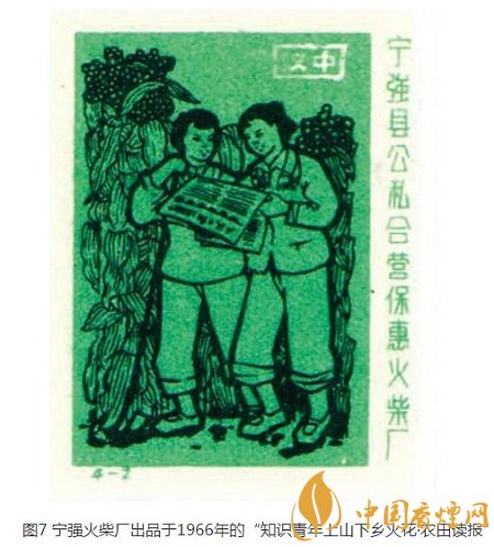 寧強(qiáng)火柴廠出品于同年的四枚/套的“知識青年上山下鄉(xiāng)”火花,其中“農(nóng)田讀報”(圖7)一枚,反映了兩名下鄉(xiāng)女知青在生長茂盛的農(nóng)田地頭捧讀《人民日報》,藉以尋求怎樣讓農(nóng)田獲得高產(chǎn)的良策。