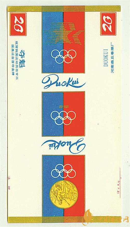 1984年,在美國洛杉磯舉行的第23屆夏季奧運(yùn)會(huì)上,我國射擊運(yùn)動(dòng)員許海峰實(shí)現(xiàn)了我國奧運(yùn)金牌零的突破。為祝賀我國運(yùn)動(dòng)員取得好成績,上世紀(jì)80年代,河南商丘卷煙廠出品了多個(gè)版本的“奪魁”煙標(biāo)。其中一個(gè)版本的“奪魁”煙標(biāo)(圖①),圖案采用紅色、藍(lán)色和金色為主要配色,主版圖案為洛杉磯奧運(yùn)會(huì)會(huì)徽,左側(cè)位置印有“祝賀我國運(yùn)動(dòng)員在廿三屆奧運(yùn)會(huì)首奪金牌”字樣,副版上印有奧運(yùn)會(huì)金牌圖案和奧運(yùn)五環(huán)標(biāo)志。同時(shí)期,山東兗州卷煙廠出品了“五洲”煙標(biāo),主、副版圖案分別為第23屆夏季奧運(yùn)會(huì)會(huì)徽和奧運(yùn)五環(huán)標(biāo)志。