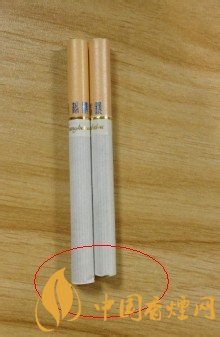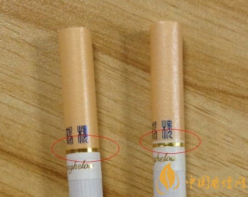 左邊真煙金色圓圈部位與煙嘴結(jié)合比較完美,毫無縫隙,而且色澤靚麗印刷不拖泥帶水,細看右邊的金色圓圈與煙嘴結(jié)合空隙較大,中間居然脫節(jié)了。而且光圈也比較粗糙。