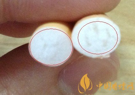 細看煙嘴角顏色,左邊黃色較右邊顯得較深,光憑這點可能會受光線的影響,用力揉搓煙嘴,就會發(fā)現(xiàn)右邊假煙部分濾嘴基本已經(jīng)散架,中間已經(jīng)變成了空心。而且黃色的紙也有所破損。而左邊的真煙嘴完好無損。只有些許揉捏痕跡。