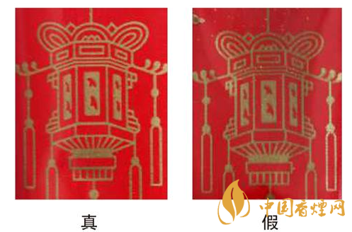 小盒側(cè)面燈籠圖案的印刷對比:真煙的三個小方格中,下面那個方格的最下面那一橫為水平的;假煙下面那個方格的最下面一橫非水平,呈一定角度傾斜。