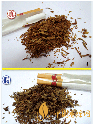 真品煙絲摻配均勻,采用獨特的“三烤”工藝,煙絲顏色呈現(xiàn)金黃色,煙絲彈性油潤性好;假煙煙絲摻雜摻假,煙梗煙末較多,煙絲未加膨化處理,煙絲碎屑多,與真品存在顯著差異。