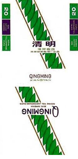 中國第一個以“清明”為牌名的煙標,是由山東益都(今青州)卷煙廠出品的“清明”煙標。白底色的畫面上醒目的“清明”兩字,底下是拼音字母“QINGMING”。綠色的枝葉簡潔而素雅,賦予了“萬物生長此時,皆清潔而明凈”的含義。