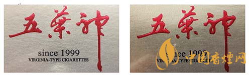 真品卷煙:“五葉神”字體筆畫(huà)流暢自然,套印準(zhǔn)確,筆畫(huà)基本無(wú)凸起,字體筆畫(huà)顏色為鮮紅。